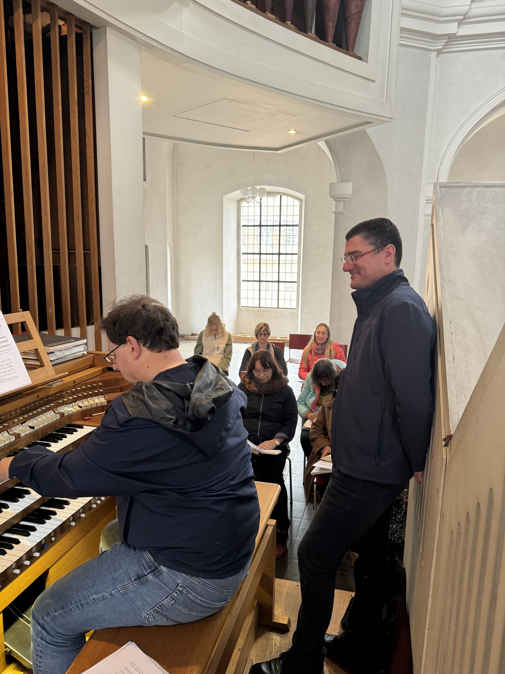 Ein weiterer Kurs beschäftigte sich mit der Gestaltung von Sätzen aus dem Orgelbuch. Die Teilnehmer konnten an der Klais-Orgel der Augustinerkirche die Impulse von Tyron Kretzschmar direkt am Instrument umsetzen und Erfahrungen austauschen. Ziel des Kurses war, den Choral bzw. das Lied als Musikstück wahrzunehmen und den Mut zur Ausgestaltung zu wecken.