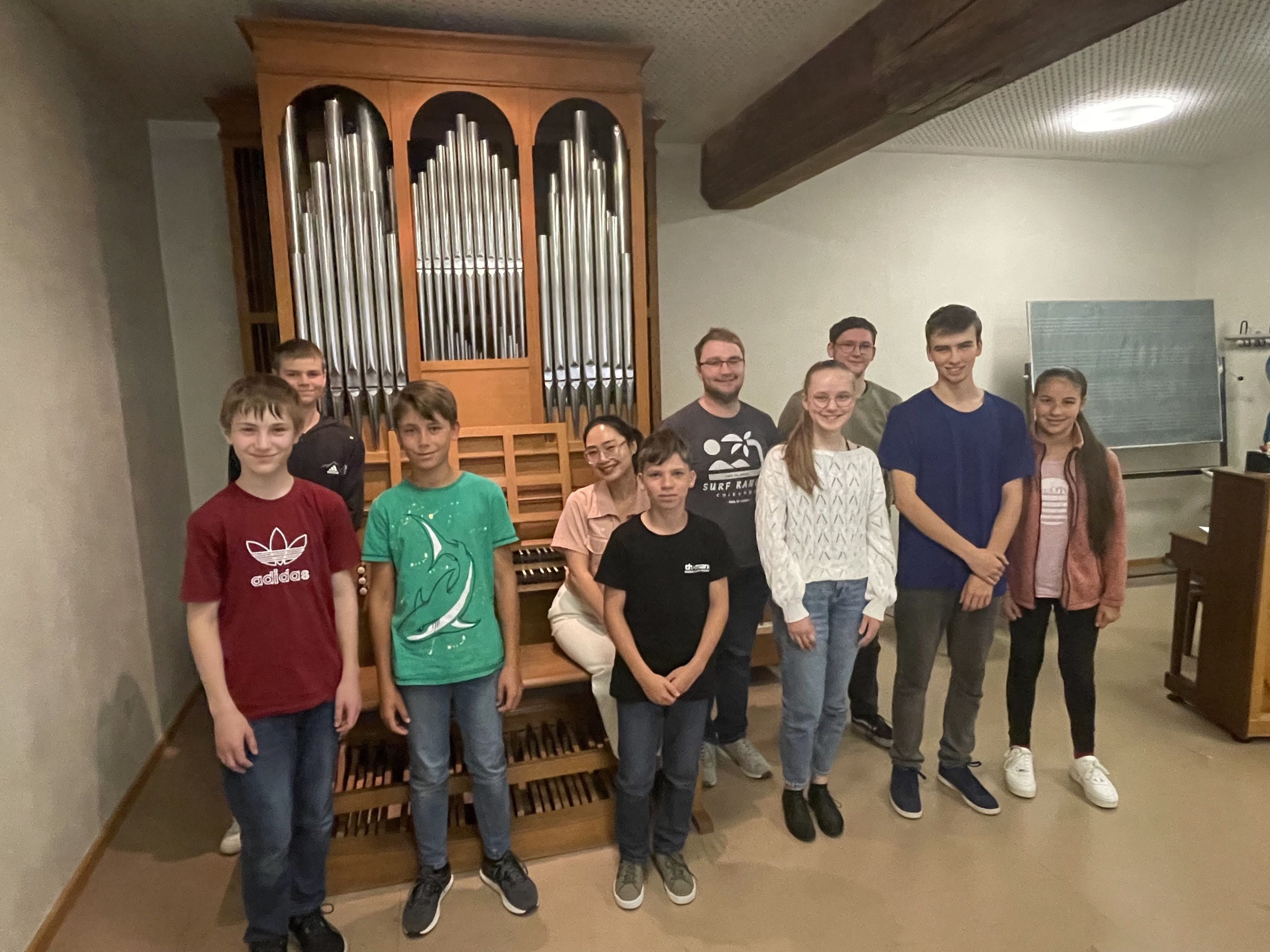 Am 3. Juli fand im Orgelübungsraum des Regionalzentrums für Kirchenmusik Bad Kissingen in Bad Neustadt ein Vorspiel der Orgelklassen von Regionalkantor Peter Rottmann und Dekanatskantor Matthias Braun statt. Elf Schülerinnen und Schüler präsentierten ihr Können vor einem zahlreich erschienenen Publikum. Dabei spielten die jungen Organistinnen und Organisten aus den Anfangsklassen, neben Orgelstücken aus den jeweiligen Orgelschulen, auch eigene Kompositionen. So spielte der 13-jährige Hannes Fischer aus Hohenroth zum ersten Mal seinen "melancholischen Walzer" vor großem Publikum. Die Fortgeschrittenen begeisterten mit den virtuos vorgetragenen "Variationen über Amazing Grace" von Denis Bédard sowie das stilsicher gespielte "Präludium in C" BWV 547 von Johann Sebastian Bach (Thanh Thanh Vo Hoang). Mit von der "Orgelparty" waren Marie Keßler, Luisa und Jonas Freund, Heiko Heurung, Elias Trabert, Hannes Adam und Leonard Weber. Mit einer gemeinsamen Strophe von "Großer Gott, wir loben dich" unter der Begleitung von Heiko Heurung klang die gelungene Veranstaltung aus.